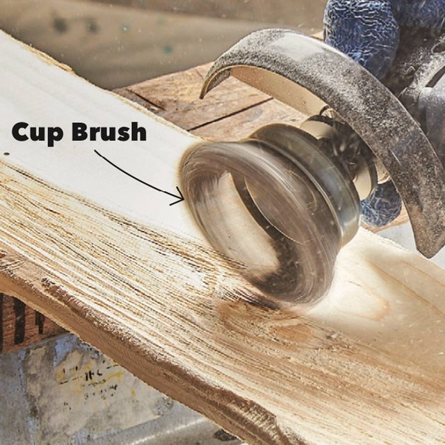• Remove some of the soft wood from between the growth rings (darker wood grain) by running the cup brush along the board.