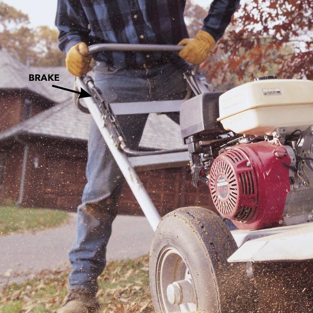 Set the brake. Push down on the handle-bars to raise the cutter head free of obstructions and start the engine. It’s a little tricky to hold the handlebars down and start the engine at the same time, so you may need a helper. Throttle the engine to full open.