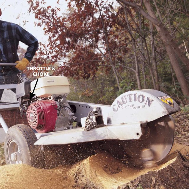 Remove the tow bar and roll the grinder up to the stump. Adjust the handlebars so they’re at a comfortable working height—about waist height.