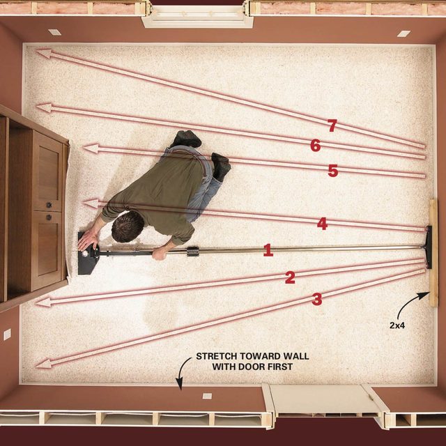 Plant the power carpet stretcher against the opposite baseboard and add extension sections until the gripping head is about 6 in. away from the wall. Push down on the lever of the power carpet stretcher and embed the carpet backing on the tack strips with your hand. Follow the sequence below.