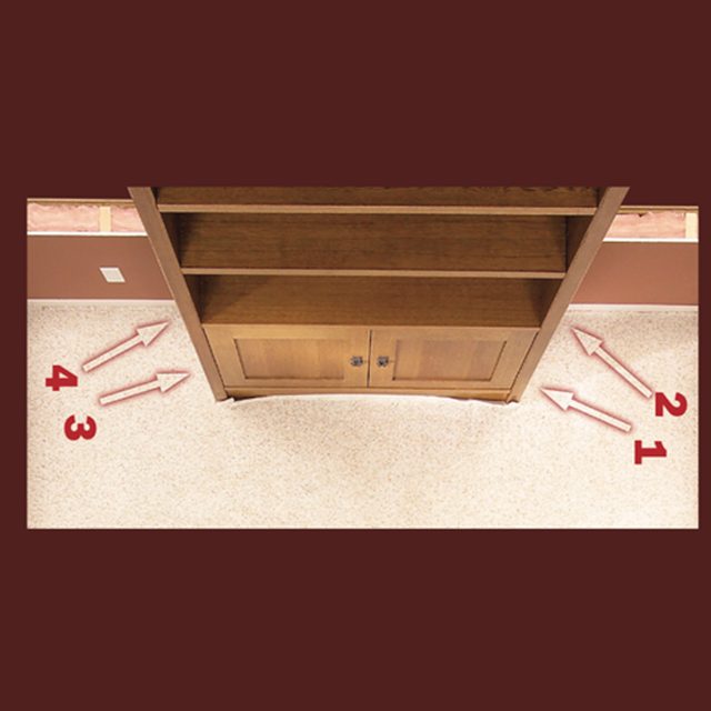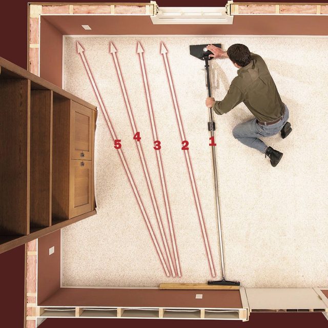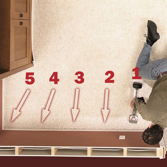 Power-stretch the length first, following the numbered sequence shown. Beginning at one end of the built-in, stretch the carpet and then push the carpet backing into the tack strip with your hand. Stretch in 18-in. increments, moving first toward any side wall that has a door. Then finish stretching against the built-in and the wall at the other end.