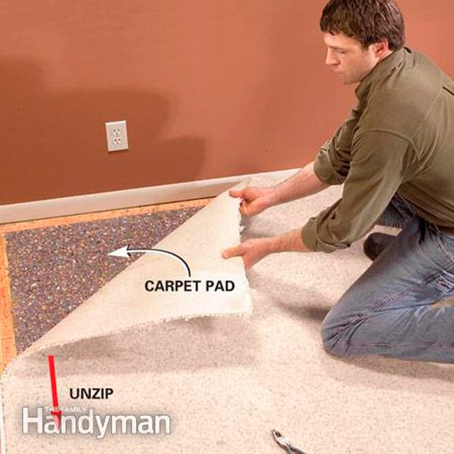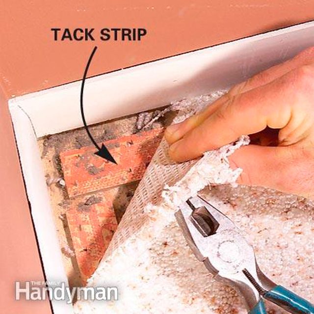 Dig the staples out of the carpet pad with a screwdriver or needle-nose pliers. Be patient and get them all. Otherwise the pad will rip. Lift one corner of the carpet with a pair of pliers and gently tease it free of the tack strip (Photo 1). But be careful; it’s easy to unravel the fibers. Then you’ll be able to grab hold of the carpet and pull it away from all the tack strips like a zipper. Also be careful not to pull the carpet past doorways where you might break a seam. You’ll have to hire a pro to come and fix it.