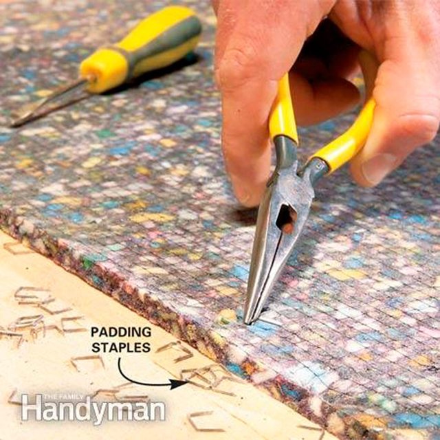 Before you pull back the pad, pull out all of the staples with a screwdriver and pliers (Photo 2). Don’t pull the pad through the staples, or it will rip. If you have any pesky floor squeaks, this is the perfect time to take care of them. Walk around the room with a keen ear and mark the squeaks on the floor. Fix them by screwing the subfloor to underlying floor joists with 2-1/2 in. screws. Now go ahead and install that new bookcase and we’ll show you how to reinstall the carpet.