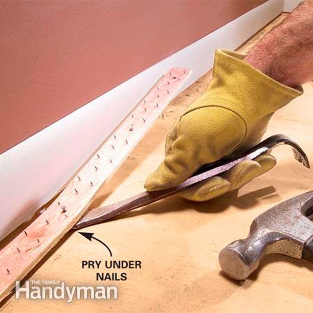 Tack strips always come in 4 ft. lengths and are available with concrete nails for slabs or standard nails for wooden floors, so be sure to get the right kind. Cut the strips to length with a tin snips (Photo 4). If you can’t get at the setting nails because of an overlying toekick or an overhang, pull them out and set the tack strip in a bed of construction adhesive. But wait overnight for the glue to set before stretching the carpet. Or use a cold chisel or flat bar as we show in Photo 5.