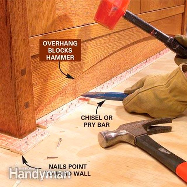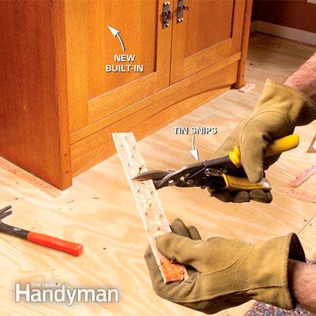 Pry out as many 4 ft. sections of tack strip with a pry bar as needed to clear the new built-in. Then discard them. Tack strips have prestarted setting nails that secure them to the floor and needle-sharp nails driven at slight angles that grip the carpet after it’s stretched (Photo 3). Wear gloves when handling them or I guarantee you’ll have blood on your hands! If you have a wooden floor, pull up and discard as many 4 ft. tack strip sections as needed to clear the base of your project. It’s easiest to pry them up by pounding a pry bar under the setting nails (Photo 3).