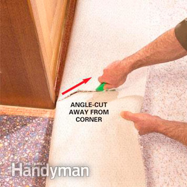 Then roll the carpet against the new built-in and make diagonal cuts away from the corner (Photo 7). Then cut off all but 3 in. of the excess with a utility knife. Work from the underside to make cutting easier. You’ll cut off the 3-in. overlap after stretching, as we show in Photo 10.