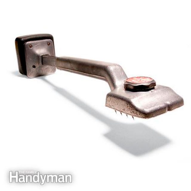 The most important tool to rent is a “power” carpet stretcher (Photo 8). It does the lion’s share of the carpet stretching. If you have tight areas where the power carpet stretcher won’t fit (spaces less than 3 ft. from adjoining walls), you’ll also need to rent a “knee kicker.” If a carpet cutter is available, rent it, too (Photo 10). It’ll cut off carpet edges more cleanly and accurately than a utility knife. In addition to these tools, you’ll need a pry bar to remove the tack strip (Photo 3), a stapler with 5/16-in. staples to reinstall the pad, and a tin snips or a chisel to cut the new tack strips to length (Photo 4).