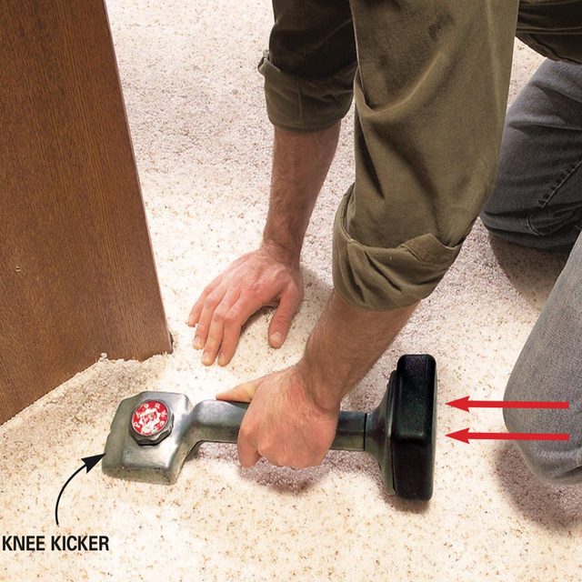 Stretch any remaining tight areas with the knee kicker. Rest the teeth about 6 in. back from the wall or built-in and “kick” with the spot above your kneecap. Then embed the carpet with your hand.