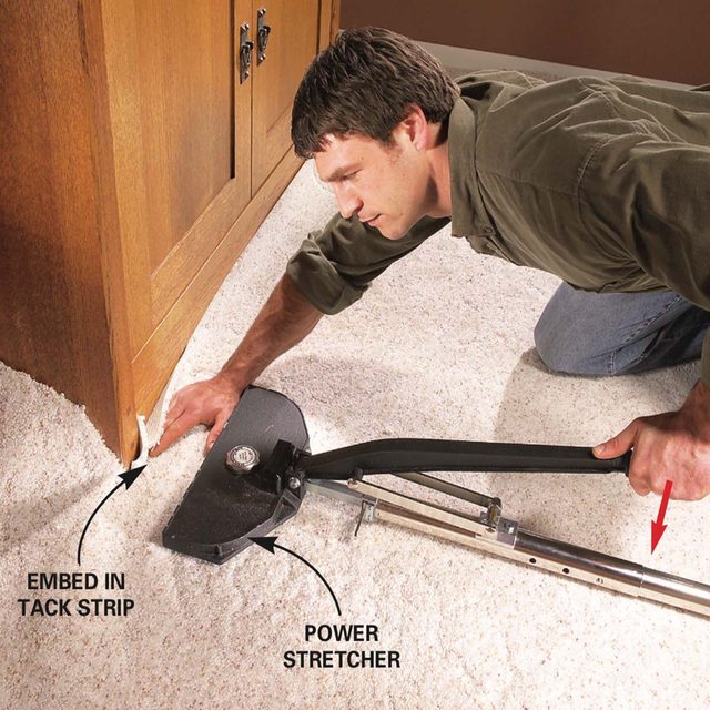 The power carpet stretcher kit comes with extension sections so you can adjust the shaft length to the room dimensions. It works by bracing one end against a wall while you embed the teeth of the head in the carpet about 6 in. away from the unanchored edge. As you force the lever down, the teeth dig through the surface fibers, grip the carpet backing and stretch the carpet. Before you release the handle, push the carpet into the tack strip directly in front of the head. Protect the wall or woodwork by resting the “pushing” end against a short length of 2×4 (see the stretching sequence below).