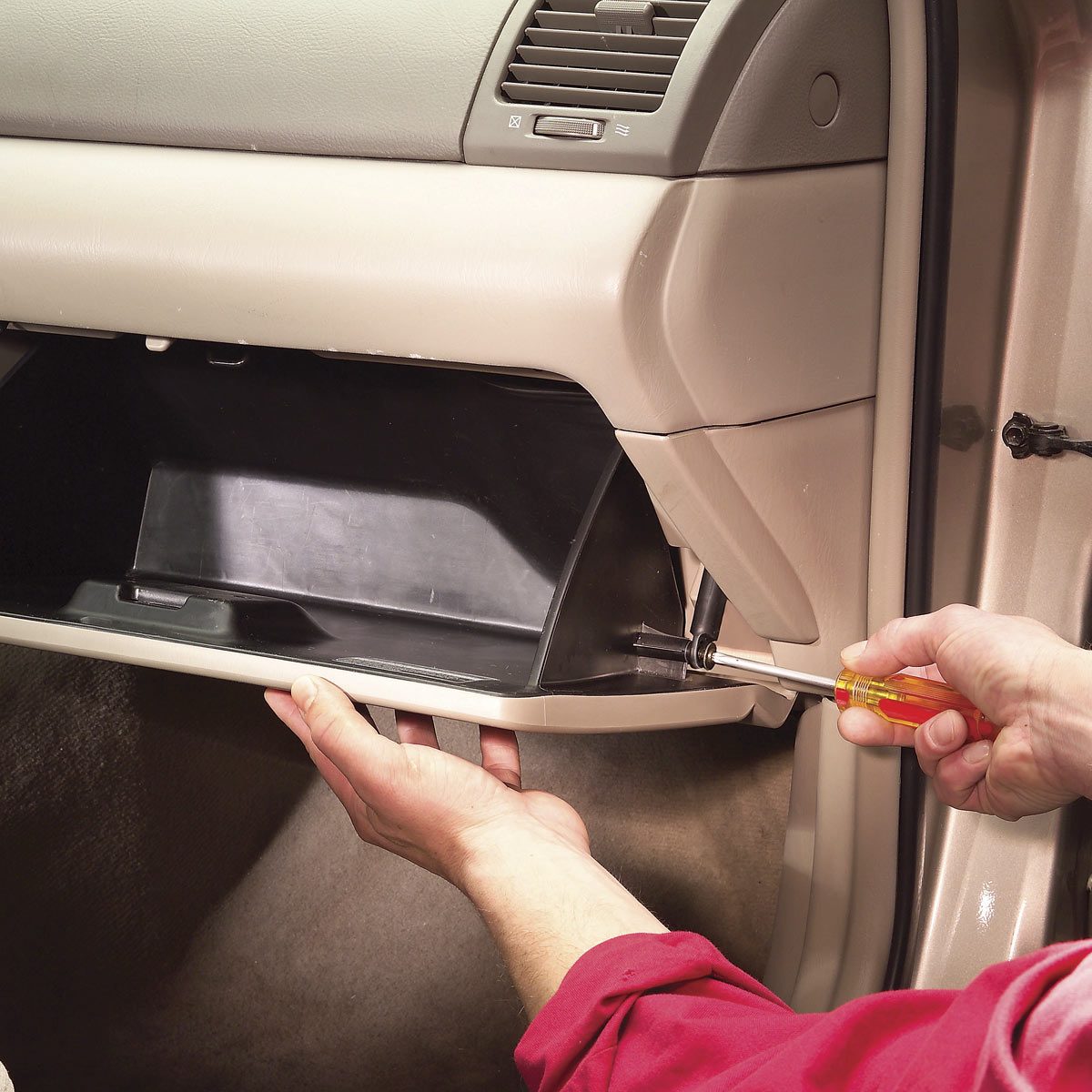 Unscrew the glove box hinges. Then press in on both sides of the glove box to tilt it down and pull it free to access the filter tray.