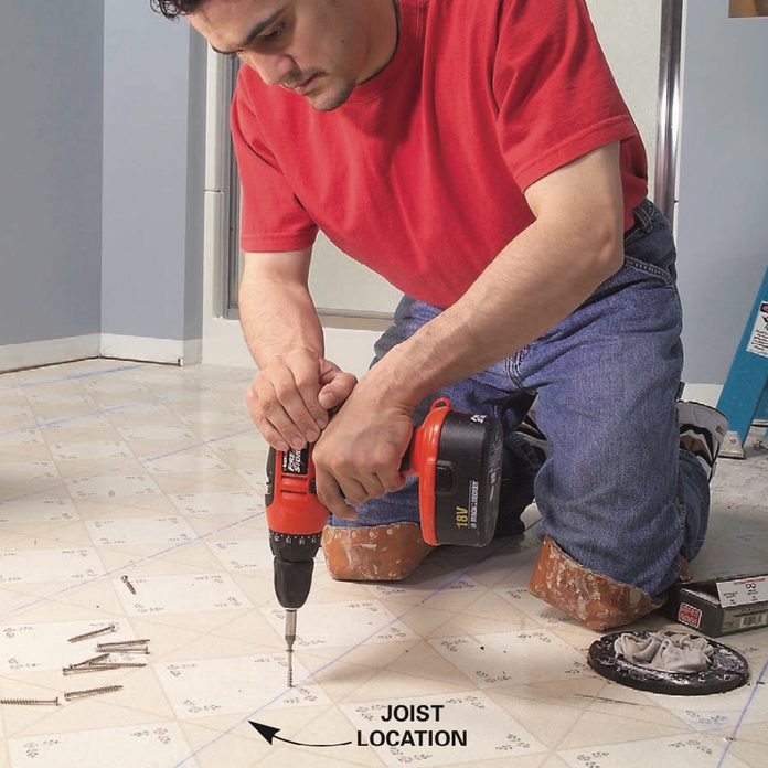 - Mark the floor joists with chalk lines and drive 2-1/2-in. screws every eight inches through the floor into the joists (Photo 2). This ensures that the subfloor and underlayment are securely fastened. Don’t leave any screw heads protruding.