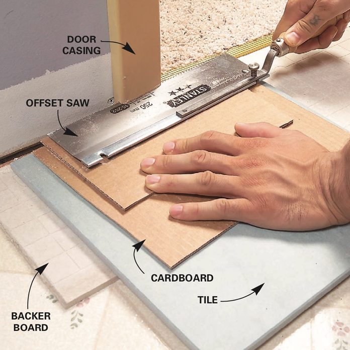 - Undercut door trim using a jamb saw or handsaw. Stack a piece of backer board, tile and two layers of cardboard raise the saw to the correct height above the floor. (Photo 3)