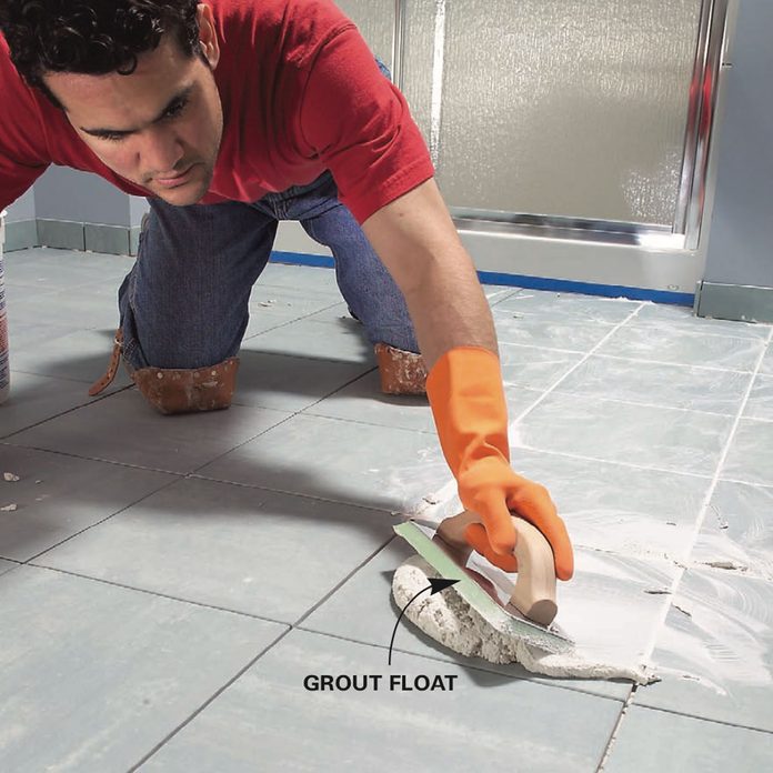 - Work the grout back and forth across the floor, diagonal to the joints and holding the float at a 45-degree angle. Then scrape off the excess grout, holding the float almost upright.
