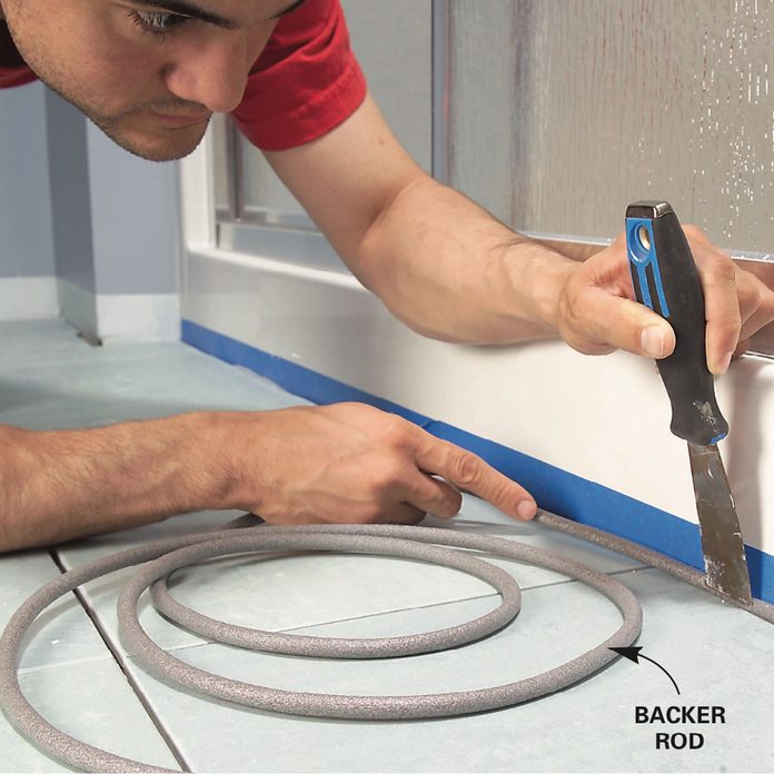 - Push backer rod into joints that will be caulked later. The foam rod keeps grout out of joints. After grouting, pull out the rod and caulk the joints. (Photo 15)