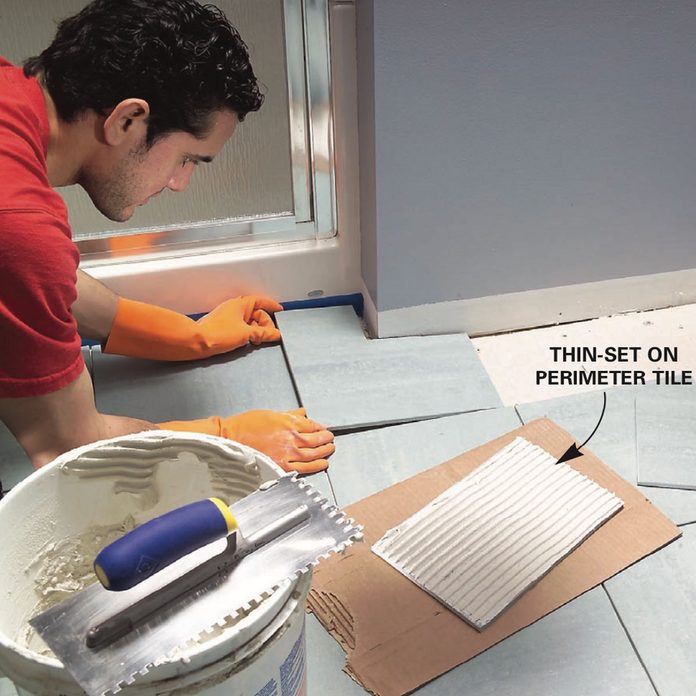 - Cut and set the perimeter tiles after the thin-set beneath the full tiles has hardened. In spaces too narrow for your trowel, comb thin-set onto the backs of tiles. (Photo 12)