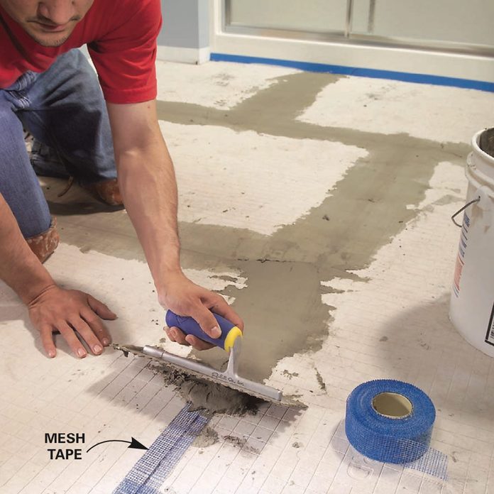 - First, press adhesive-backed mesh tape over the joints and skim over the tape with thin-set. When the thin-set is firm but not fully hardened, scrape away any ridges with a putty knife. (Photo 8)