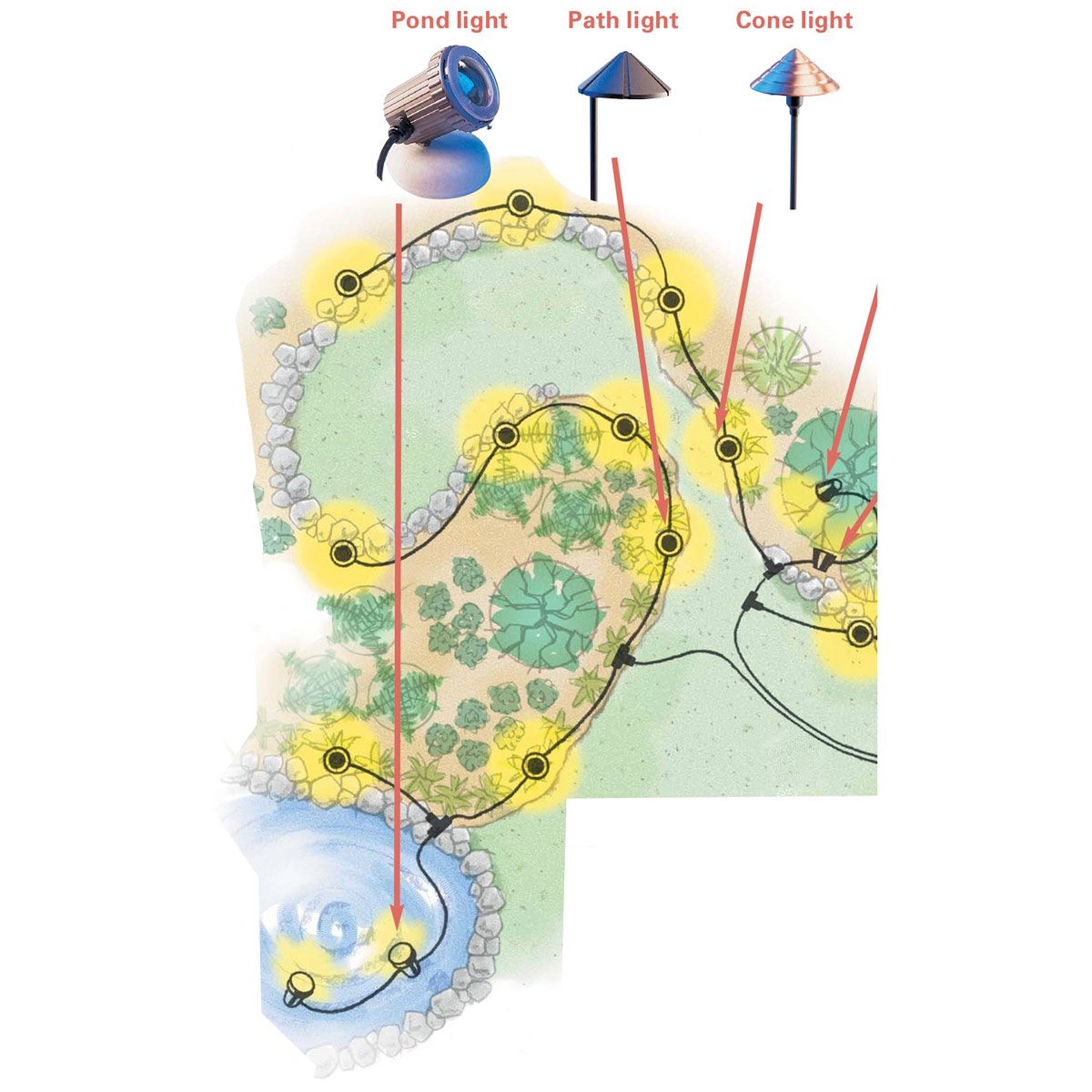 Pond lights are watertight and held in place on the pond bottom by a weighted base. They also have a long cord so you can bury your wire connections in the drier dirt at the pond’s edge. To get an idea of the pond light effect, see the opening photo. Pro tips for better design, layout and installation of low voltage lighting: Take the time to install your lights correctly and they’ll last longer, cast more light where you want it and require less maintenance. Get a first-class installation using these tips: