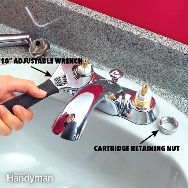 Shut off the water to the sink. Remove the faucet handles. Most are held on by retaining screws under the caps on the top of the handles. Our handles were held on with small Allen screws located under the handle. Then unscrew the large nut that holds the faucet cartridge in.