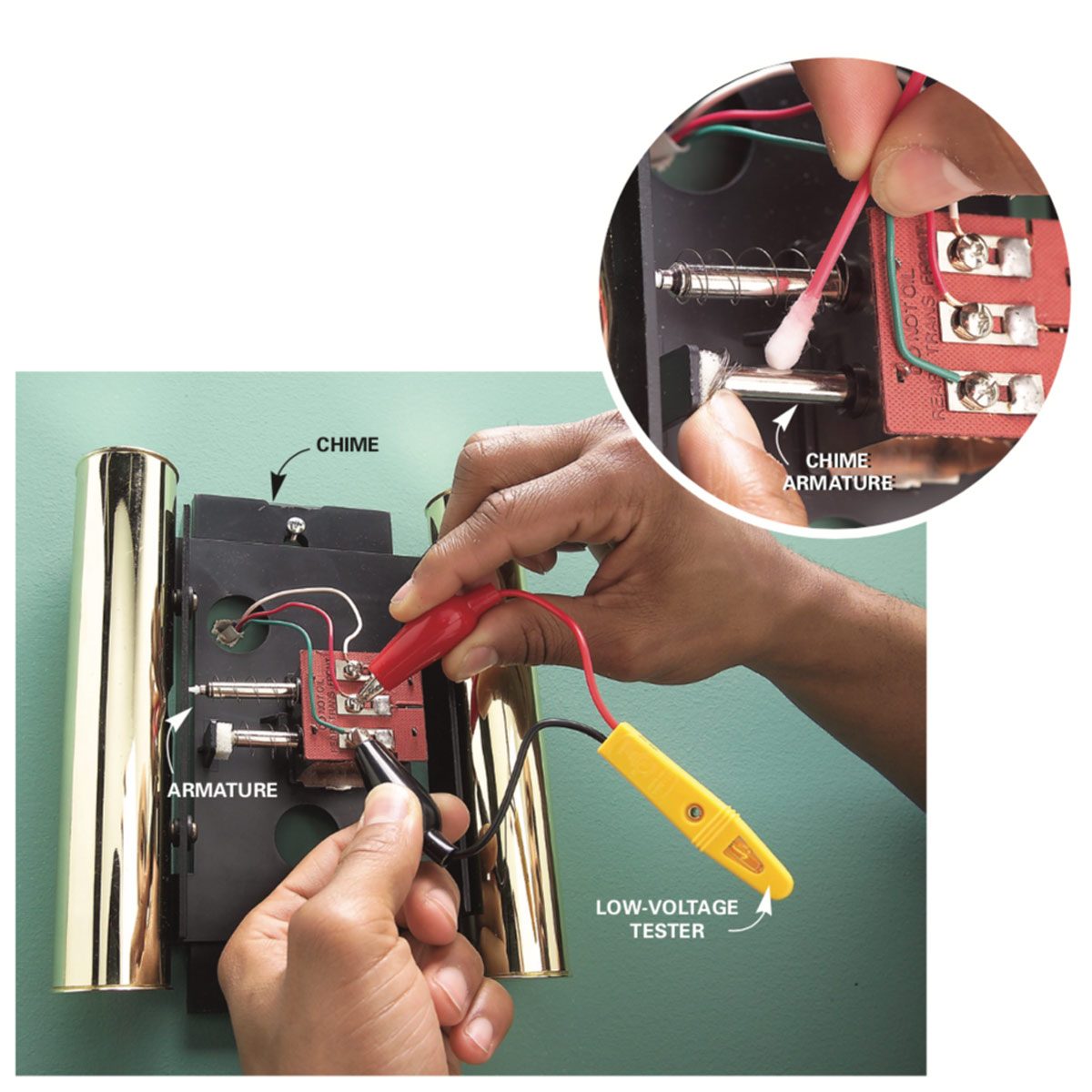 With the other probe, touch the front or back door terminal while a helper pushes the button. If the tester lights up, you know the chime is receiving power and there’s something wrong with the chime itself. Sometimes the armatures are too grimy to move. Clean them with rubbing alcohol and move them with your finger. Then try the button again.