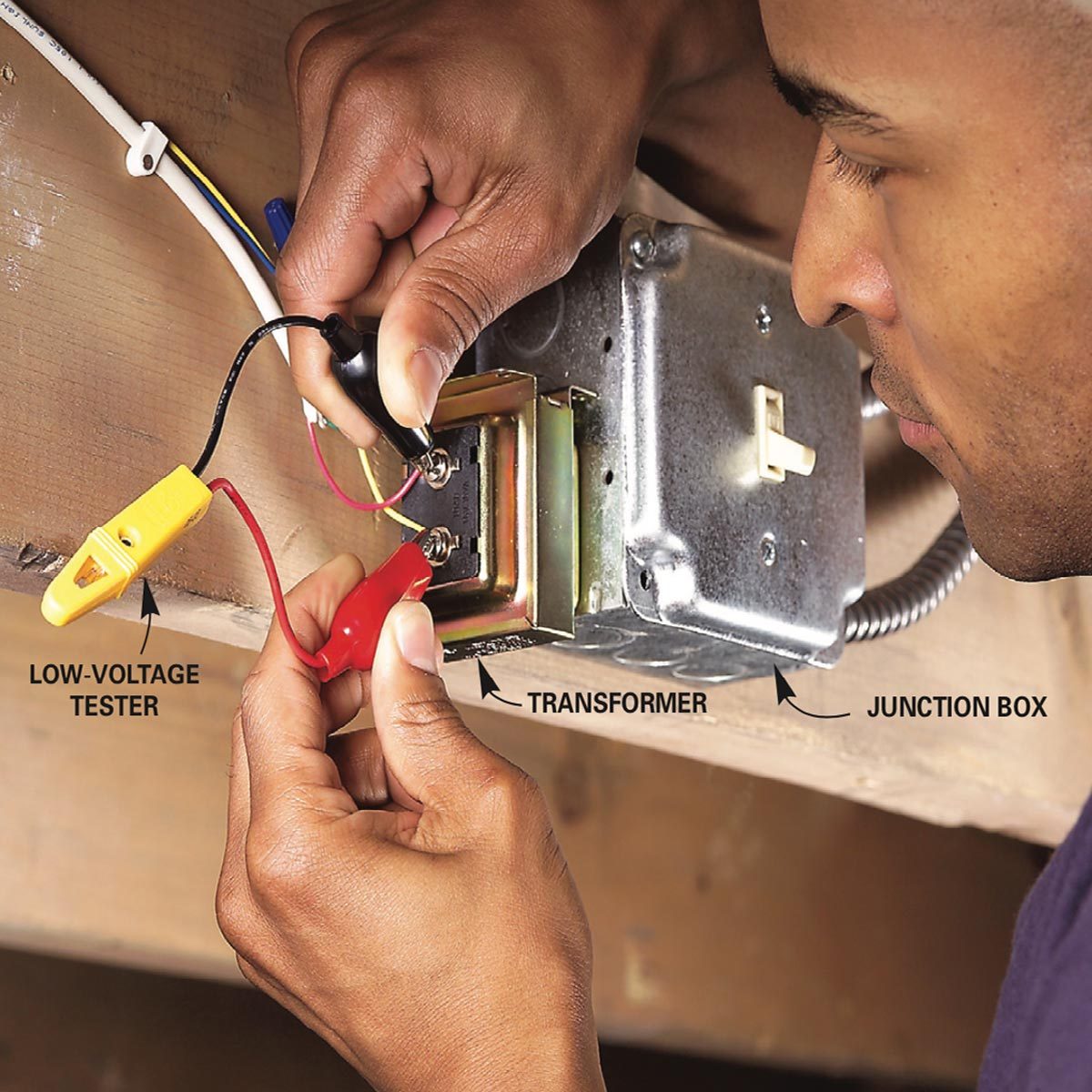 The transformer, which converts standard household voltage to low voltage, is the least likely component to cause doorbell trouble. It can be located anywhere in your home, but you’re most likely to find it on a metal junction box near your heating/cooling system or mounted on the outside of your main electrical panel. First, make sure the bell wires are securely connected to the transformer terminals. Then test the transformer.