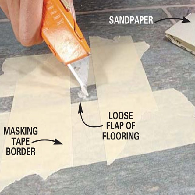 The easy maintenance of vinyl and linoleum flooring makes it ideal for bathrooms, kitchens and other busy areas. However, heavy, hot or sharp objects can damage this tough material, and nothing looks worse in the middle of the floor than a conspicuous blemish. The Vinyl Floor Repair Kit allows you to repair those unsightly burns, cuts and gouges in your vinyl or linoleum flooring. It’ll disguise imperfections up to the size of a quarter. The kit is available at hardware stores or online. Prepare the surface for patching as shown in Photo 1. Keep the tape 1/2 in. back so the repair adhesives don’t glue it to the floor. Here, learn how to patch a tile.