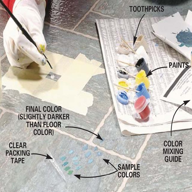 Mix the paint to match the floor color, and paint the inside surface and edges of the damaged area. Clean off any paint that gets on the surrounding vinyl surface. Let the paint dry for 15 minutes, or speed up the drying time with a hair dryer on low heat. Mixing the special paint to match your flooring color is the trickiest part of the fix. The included color-matching guide will help you determine basic colors, but a closer match will require a little trial and error. An exact color match may not be possible, but if it’s close, it’ll be virtually indistinguishable at normal viewing distances.