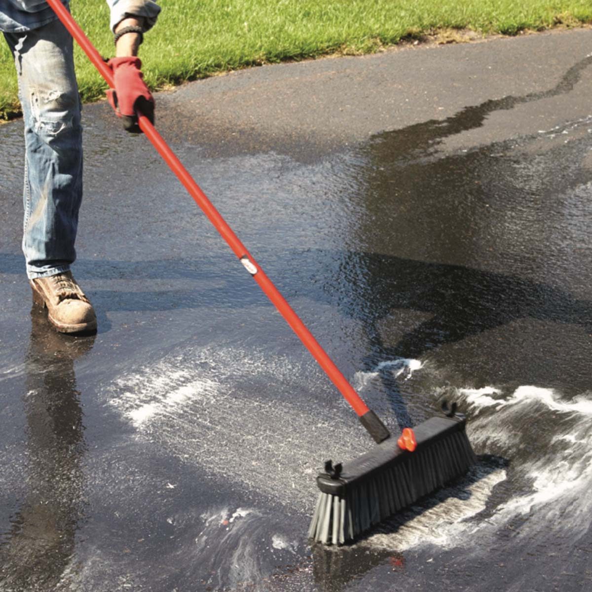 Use the soap nozzle on your power washer or a garden hose applicator to apply the driveway cleaner. Then scrub the entire driveway with a stiff-bristle push broom.