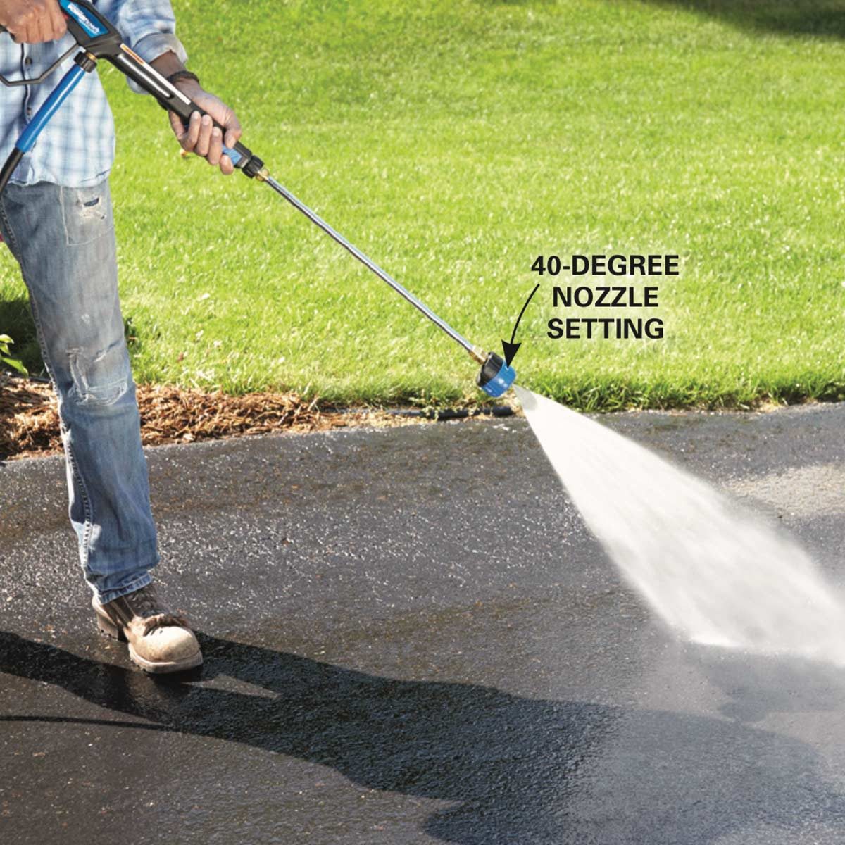 Flush the soap and dirt residue with a 40-degree power washer nozzle or a strong stream of water from your garden hose. Next, rinse the driveway with clear water (Photo 2). Let the driveway dry completely before applying the sealer. Then perform a final sweep with a push broom.