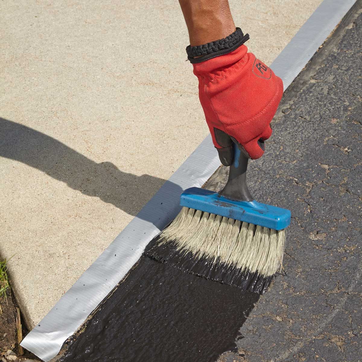 Dip the dashing brush into the sealer and apply a liberal coating to all four edges of the driveway. Don’t spread it too thin; you want it to fill in all the pores. Next, cut in all four edges of the driveway with a large dashing brush (Photo 5).