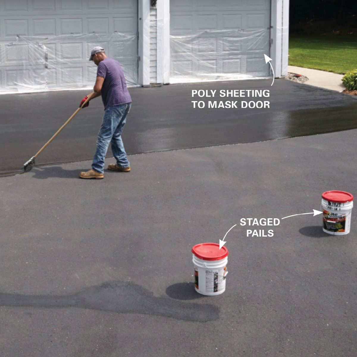 Guesstimate the coverage of each pail and stage each additional pail along the driveway. That saves time and reduces the need to walk through wet sealer to get the next pail. Driveway sealer will splash onto your garage door and sidewalks as you pour it. And it’ll get all over your shoes and clothes. It’s very difficult (often impossible) to remove later, so wear old work clothes and shoes. Mask the garage door with poly sheeting and apply strips of duct tape to concrete walks where it butts up to the asphalt. Then stage the pails equally down the driveway (Photo 6).