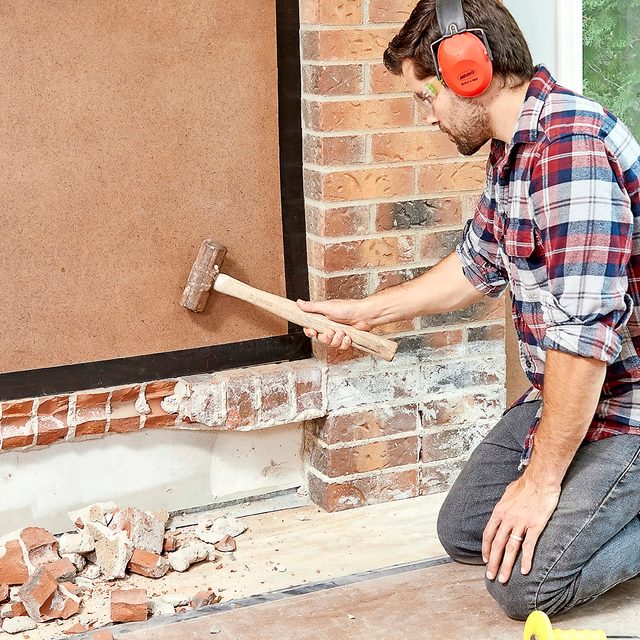 - After removing the mantel (ours wasn’t even fastened), chip out the corbels with a maul and a brick set chisel.