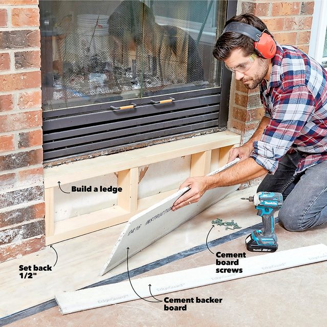 - Install edging over the sides of the fireplace and surrounding the firebox.