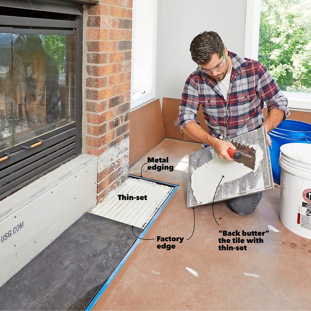 Cutting the tile around the fireplace is tricky. If the tiles don’t line up, you’ll notice, so precise cuts are important.