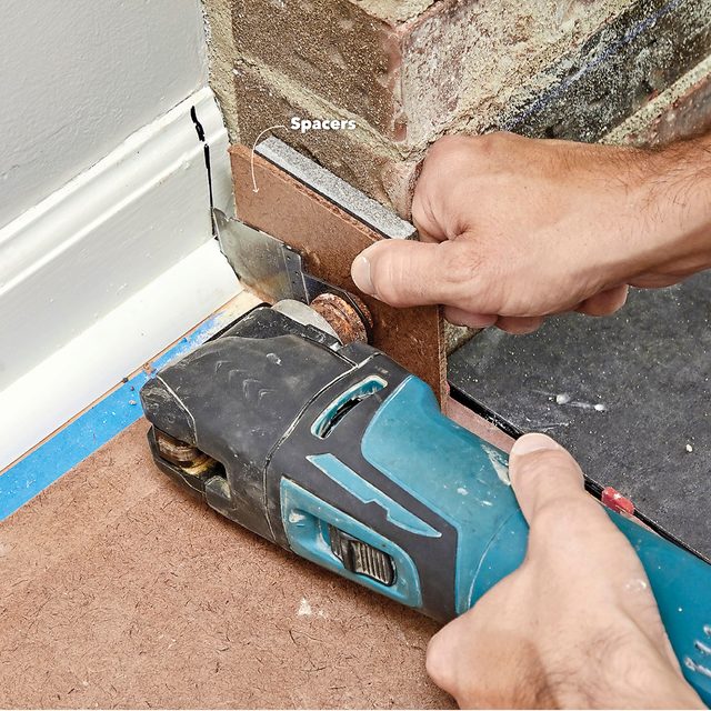 - To cut the trim, use a piece of tile and a piece of hardboard as spacers and a guide for your multitool.
