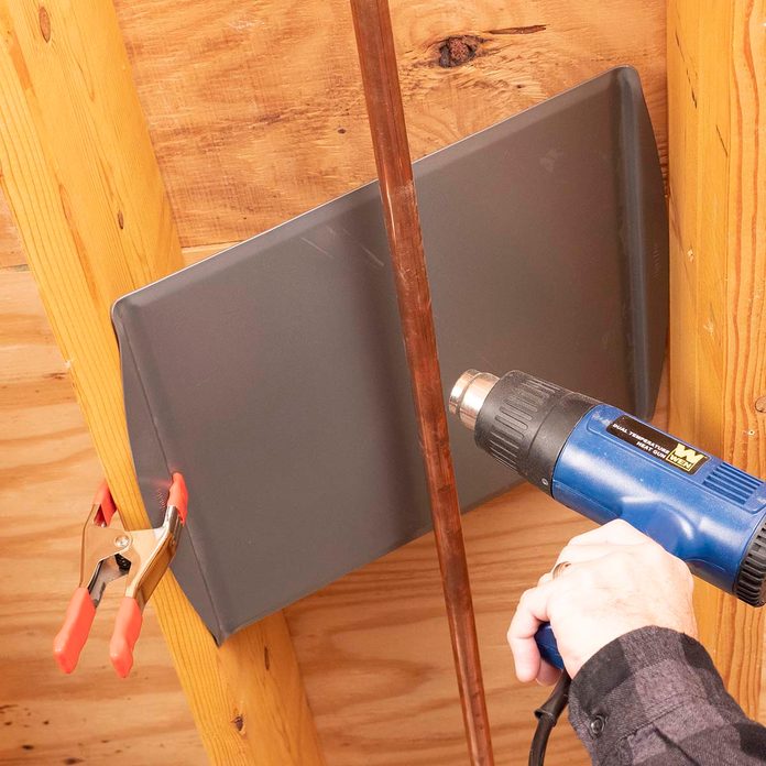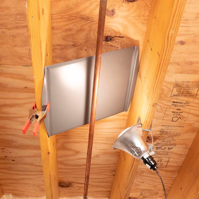 - Clip a work light with a heat lamp bulb onto the joist next to the frozen pipe. (Be sure that water doesn’t drip onto the hot bulb.)