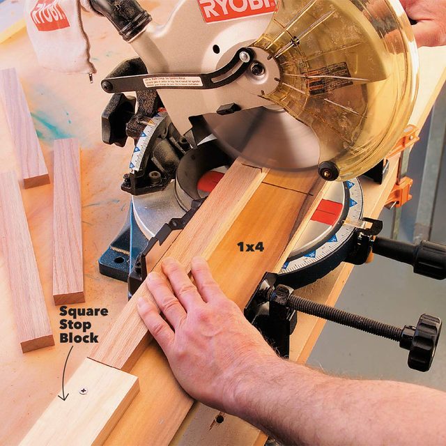 - To cut identical parts without measuring each one, screw a stop block to a 1×4 base (See the cut list measurements for this project in the photo in the diagram above.)