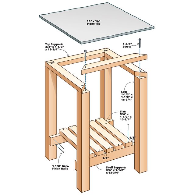 - The shelf supports and legs must meet at 90 degrees. You can position them with a square, but if you’re building more than one table, you can speed up the job by making an assembly jig. This jig is made from 1x4s screwed to plywood.