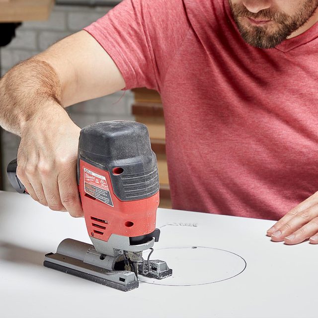 - Using a jigsaw, cut out a 6-in.-diameter hole in line with the fan’s exhaust port to run flexible duct through.