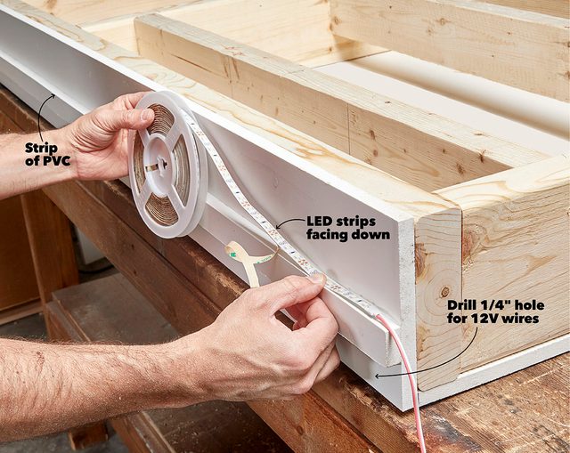 - Screw a strip of PVC along the side of the ceiling frame toward the top. Stick on the damp-rated LED strip so it faces down.