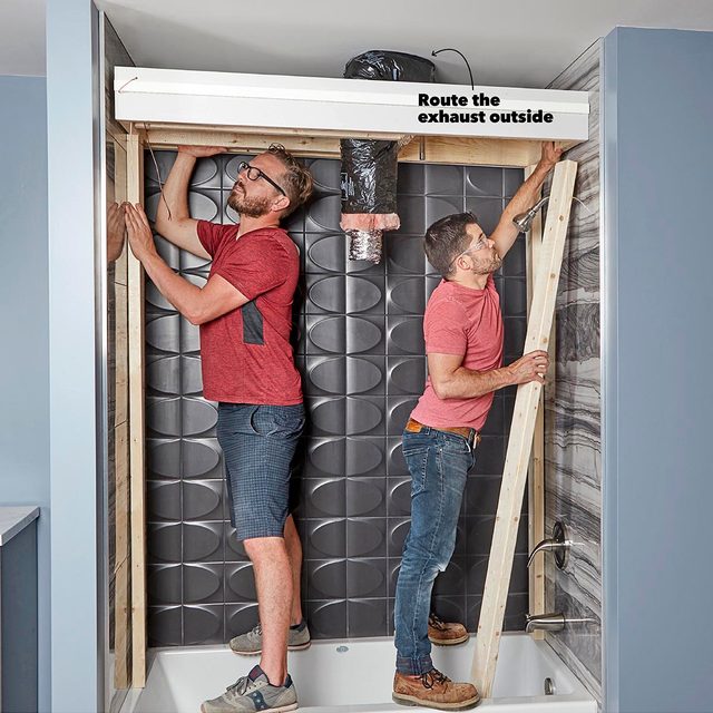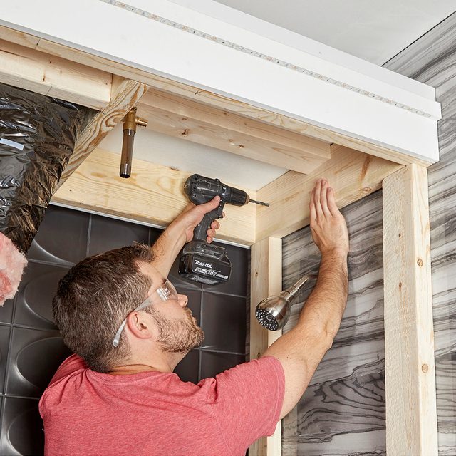 - With a helper, position the frame within the shower walls with six inches of space below the ceiling, to make room for the fan’s duct, and three inches from the back wall.