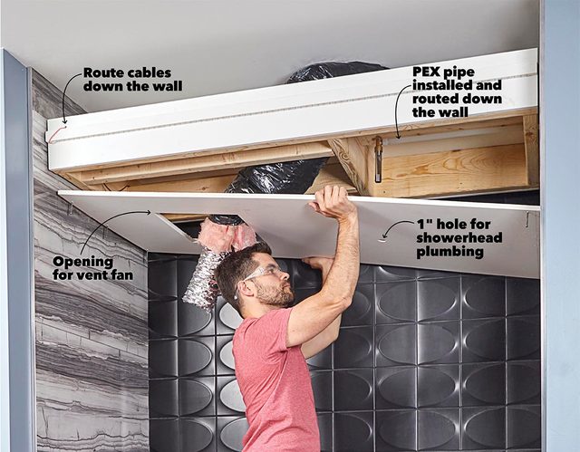 - Set the bath fan and shower head in the ceiling frame. I placed the center of the showerhead 20 inches from one side (one-third of the total length) and then centered the fan between the opposite side and the showerhead.