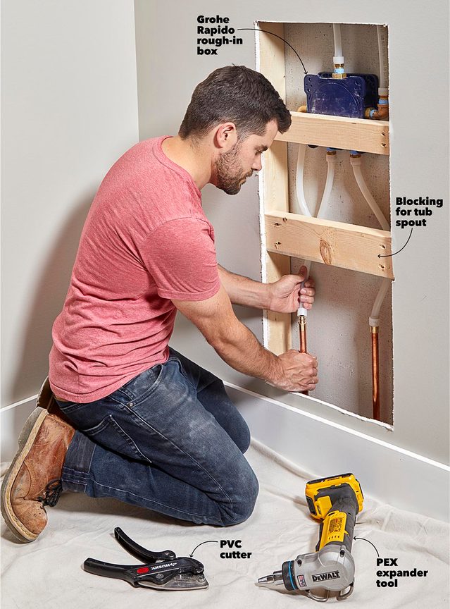 - I cut an access hole in the wall behind the shower and installed the three-way shower valve.