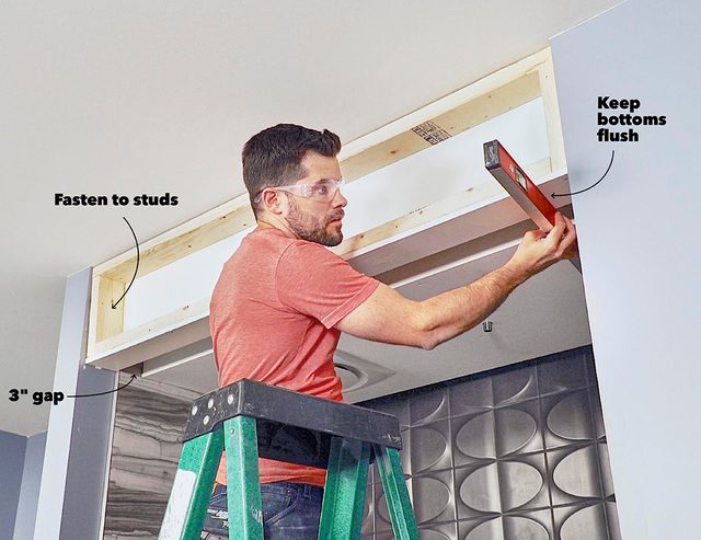 - Build a panel to be fastened three inches from the front of the drop ceiling.