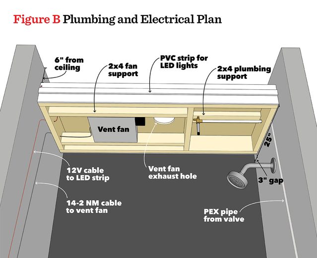 - Lighted Bath Fan: A slim-fit fan allowed me to maintain enough ceiling height and use 2x6s for the ceiling frame. This Aero Pure fan includes an LED light ($145).