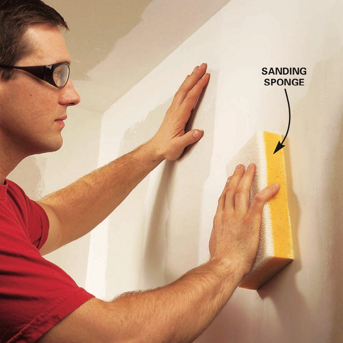 Then buy a big flat drywall sponge (inexpensive; at home centers),wet and wring it out, and simply wipe smooth any minor flaws. You probably won’t have to use the coarse side of the sponge unless you have unusually rough areas. Here are a few tips for patching drywall.